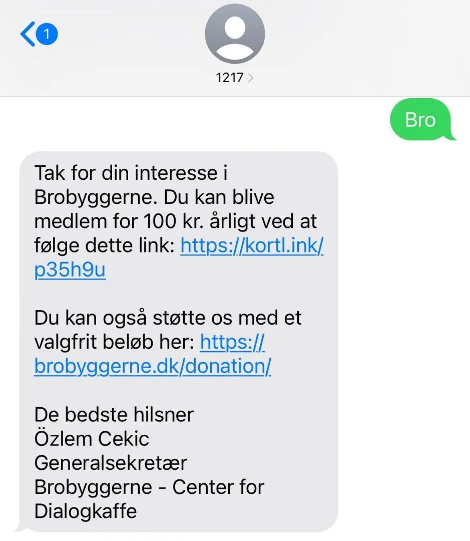 Hos Brobyggerne bruger de flittigt sms’er i deres fundraising, bl.a. som leadgenerering. Deres hvervekampagne er et godt eksempel på en kobling mellem det fysiske og det digitale, hvor de gør det nemt at blive brobygger.