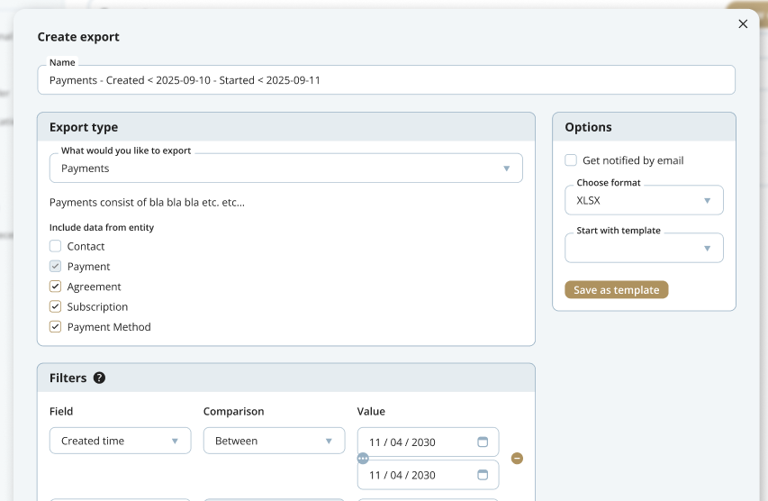 Lige nu arbejder vi på et redesign af Export-modulet. Øverst kan du se den eksisterende version. Her skal brugeren tage stilling til en lang række indstillinger, og hjælpeteksten støjer faktisk.
